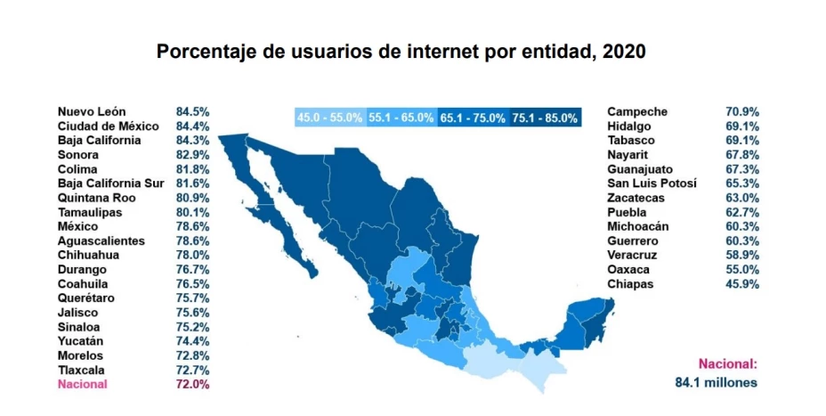 Ciudad de México.- En México, en 2020, se estimó una población de 84.1 millones de usuarios de internet, esto de acuerdo a la Encuesta Nacional sobre Disponibilidad y Uso de Tecnologías de la Información en los Hogares (ENDUTIH) 2020, que realizó el Instituto Nacional de Estadística y Geografía (INEGI), en colaboración con la Secretaría de Comunicaciones y Transportes (SCT) y el Instituto Federal de Telecomunicaciones (IFT).