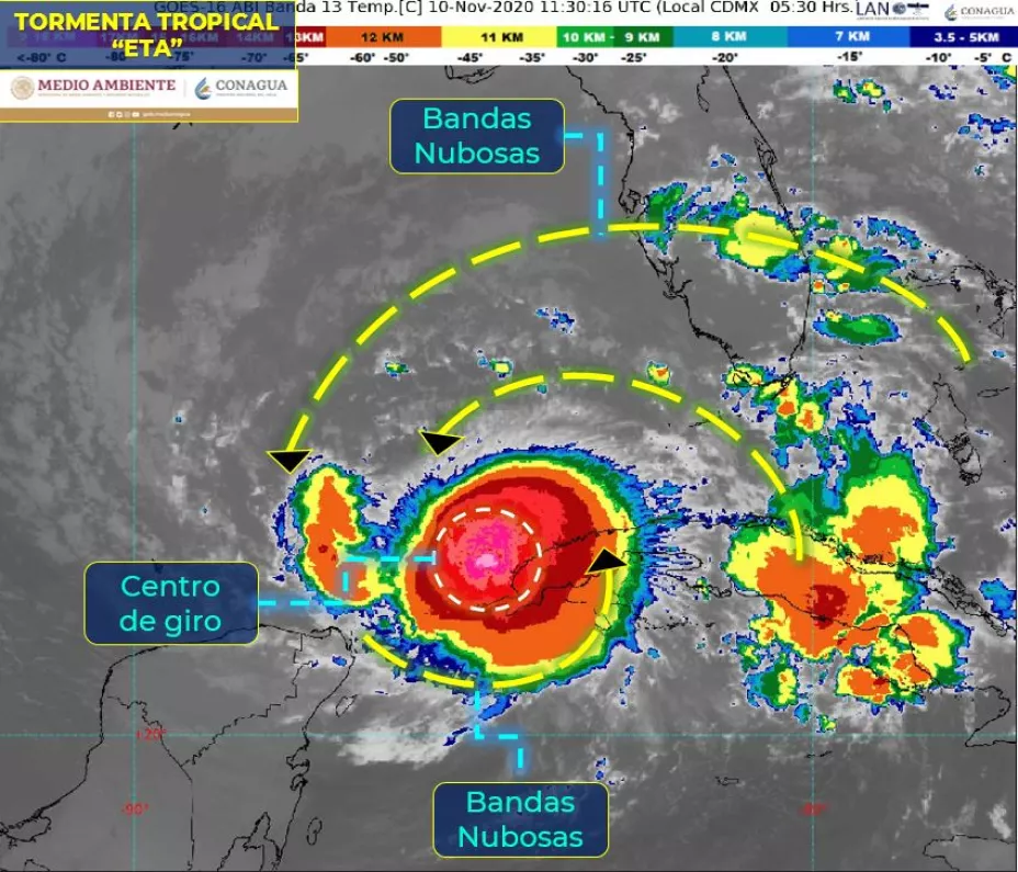 El centro de la tormenta tropical Eta se mantiene al suroeste de la península de Florida, Estados Unidos, lo que provocará lluvias, rachas de viento de 50 a 60 kilómetros por hora y oleaje elevado de uno a 3 tres metros de altura en las costas de Yucatán y Quintana Roo, así como lluvias en Yucatán y Quintana Roo.